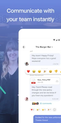 - Chat using GIFs, pics, or emojis with your co-workers