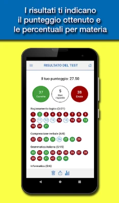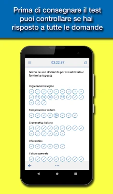 The app is designed to simulate as close as possible the test you actually have to deal with, with all the topics of the test: Logical skills, Verbal comprehension, Italian grammar, Computer science, General knowledge, English.