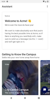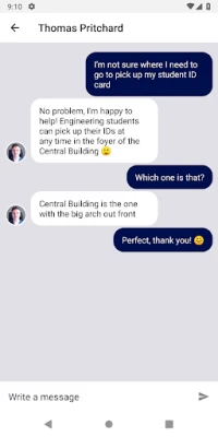 • Sometimes you need to talk to someone to solve an issue or get some info. With a quick tap of the "conversations" icon, you can be connected instantly to a trained member of staff at your university, ready to solve your problem in real-time. No more awkward emails sent out into the ether.